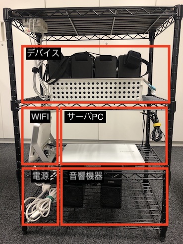 • 必要機材(サーバPC / WIFIルータ / 音響機器)の電源を入れます